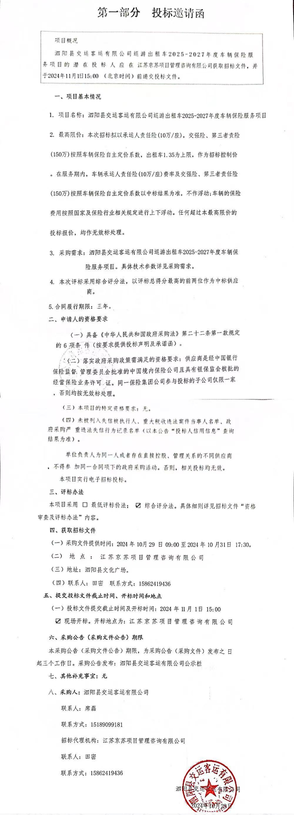 泗陽(yáng)縣交運(yùn)客運(yùn)有限公司巡游出租車(chē)2025-2027年度車(chē)輛保險(xiǎn)服務(wù)項(xiàng)目